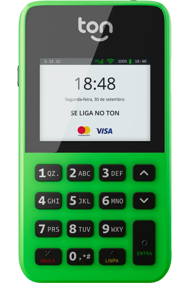 As bandeiras aceitas no Ton são: Visa, Master, Elo, American Express, Hipercard e Hiper.